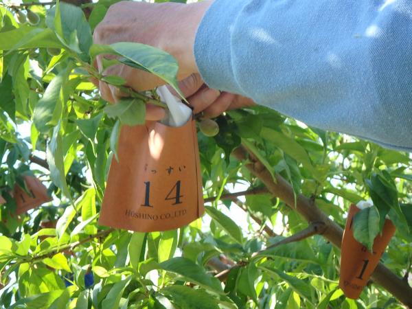 摘果を終えたあと、残した実に紙袋をかけて、保護します。この作業が「袋掛け」です。