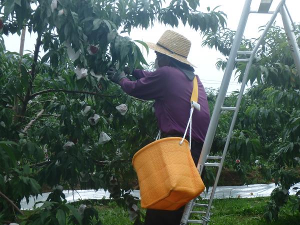 8月の湿度の高い猛暑のなか,手作業で丁寧に桃を収穫しています。