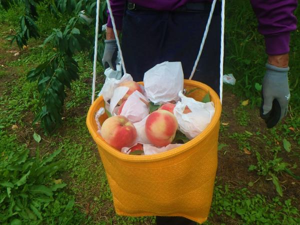収穫した桃を,肩掛けのカゴに入れてゆきます。