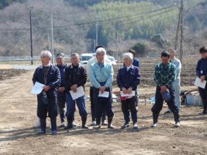 東松島市長や県議会議員,関係機関の挨拶後,宮戸地区の農地を守るために組織された「奥松島果樹生産組合(宮戸ふるさと水と土保全隊)」の尾形代表から,「多くの方々の協力でここまで来た。果樹園は観光資源ともなるため,宮戸地区全体の活性化に繋げていきたい」との話がありました。