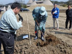 この日は,奥松島果樹生産組合の方々に加え,県や東松島市,JAいしのまきの職員が一緒に植樹を行い,約1haの農地に桃といちじくが合わせて120本植えられました。