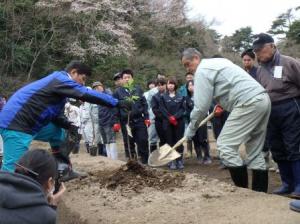 平成29年4月21日,東松島市奥松島地区宮戸8分区で果樹植栽イベントが開催されました。地元の生産組合や東松島市をはじめとする関係者約40名が,宮戸8分区(約1haの復旧農地)にイチジク130本と柿80本を植えました。