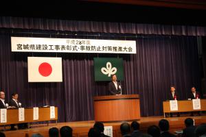 宮城県建設工事表彰式では,「優良建設工事施工業者」及び「建設工事事故防止優良者」を表彰しています。
