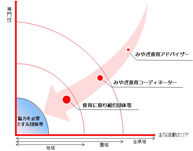 それぞれの団体の特性、専門分野等に沿った食育活動を自ら行うとともに、みやぎ食育コーディネーター等と連携し、保育所、学校、地域等の要請に応じて食育活動を支援します。