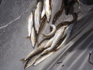 7月のアユ釣り解禁前の当調査結果により、どれくらいのアユが遡上しているのか、資源動向を把握することができます。また、堰堤をはさんだ上流・下流の調査定点の資源動向を把握することで、堰堤がアユの遡上に与える影響や、魚道設置による遡上への改善効果等を確認することができます。