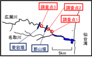 宮城県水産技術総合センターでは、アユ釣り解禁前の情報提供と資源管理のための基礎データを得るため、広瀬川において、毎年5月と6月にアユの遡上状況を調査しています。
