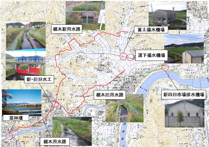 槻木用水路が新・旧分水工から二手に分かれているのがわかります。